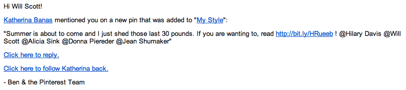 My First Pinterest Spam On April 23, 2012 By Will ScottIn internet marketing This one’s interesting. It’s Pinterest Spam by way of tagging. Click to share on Facebook (Opens in new window) Facebook Click to share on X (Opens in new window) X Click to share on Reddit (Opens in new window) Reddit Click to share on LinkedIn (Opens in new window) LinkedIn Click to email a link to a friend (Opens in new window) Email Like Loading... Related