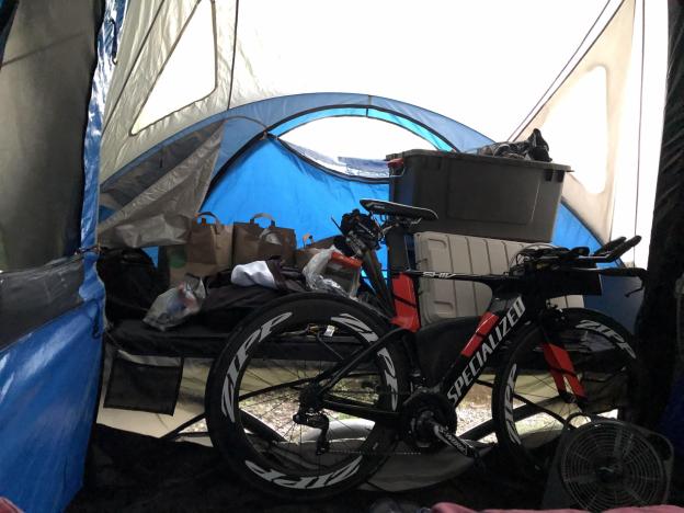 Instead of a hotel I was lucky enough to borrow this super-cool camper / tent / trailer from the Felkers – Shanna and Josh are the parents of Madison who is on Caleb and Joe’s tri team.