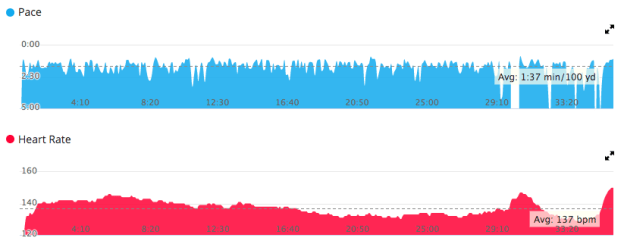 It’s pretty obvious where I hit that panic point in the image above. Where my pace drops to zero and my heart rate maxes out I was doing a back-float / stroke until I got it together. I was worried I wouldn’t be buoyant enough to just float in the swimskin, but apparently my personal buoyancy was sufficient 🙂